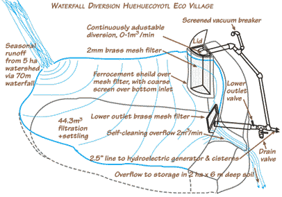 Project site: Huehuetortuga (the old, old turtle) a new landholding added to the ecological arts community of Huehuecoyotl (the old, old coyote). Elevation: 2100 m (7000 ft) Average Rainfall: zero for eight months, 1.4 m (four feet eight inches) in four months (!) Water supply during dry season: None; storage only (well, they can truck water in). Subsystems: rain water harvesting, surface water diversion, efficient fixtures, four greywater systems, constructed wetland, edible landscaping, composting toilet, solar hot water, hydro electric power, solar energy |