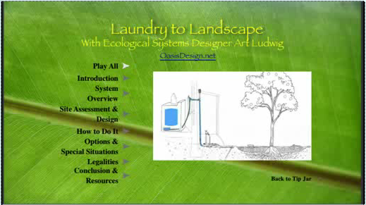 Laundry to Landscape Instructional Video Produced by Art Ludwig, published by Oasis Design, 2010. 90 minutes