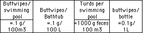 - 1 fecal coliform/ 100ml = 1 ppb = 0.001 ppm = 1 buttwipe per swimming pool = 0.001 buttwipe per bathtub